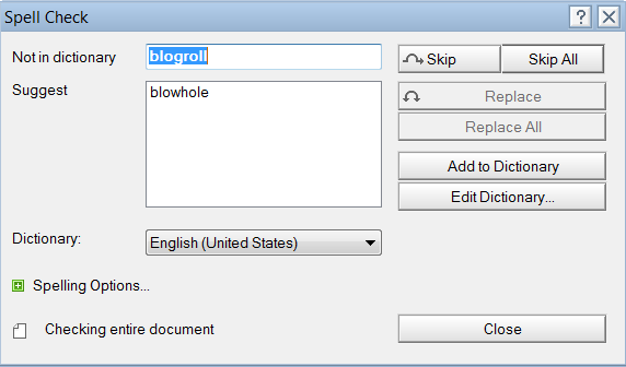 I just finished composing an email (I have auto-spellcheck enabled). When I hit send, this spell check box popped up. Good thing I wasn't sipping coffee.